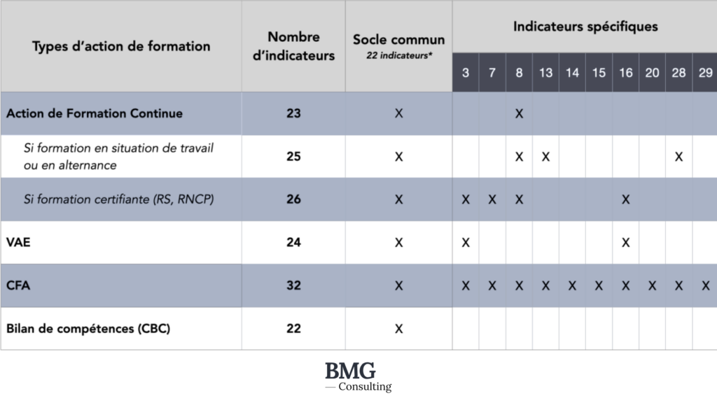 Aperçu des indicateurs applicables par catégorie d’action de formation :