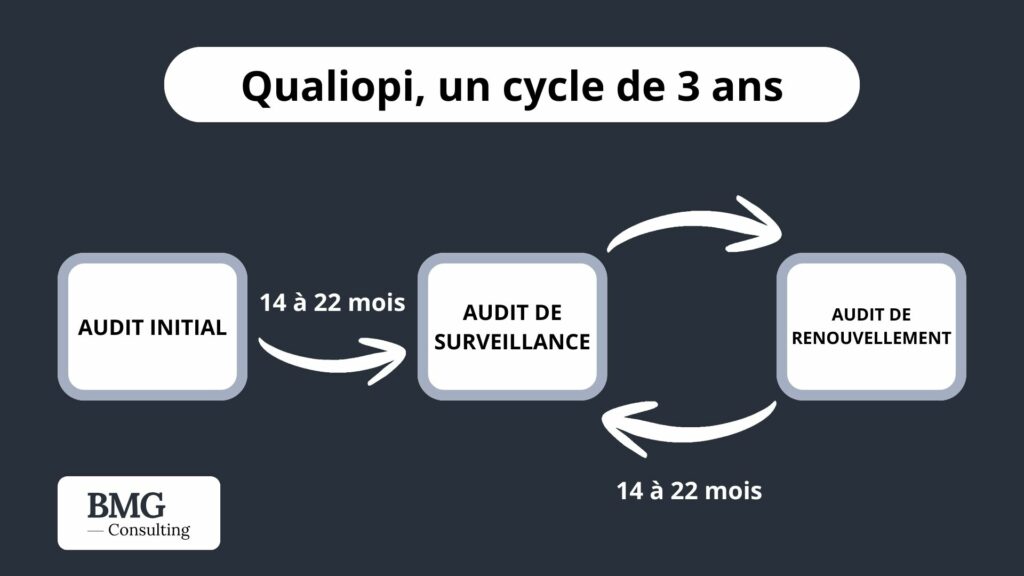 Qualiopi repose sur un cycle de certification de trois ans, rythmé par plusieurs audits obligatoires : un audit initial, un audit de surveillance intermédiaire, puis un audit de renouvellement. Ces audits sont réalisés par des organismes certificateurs accrédités, sur la base du RNQ et de son guide de lecture.
